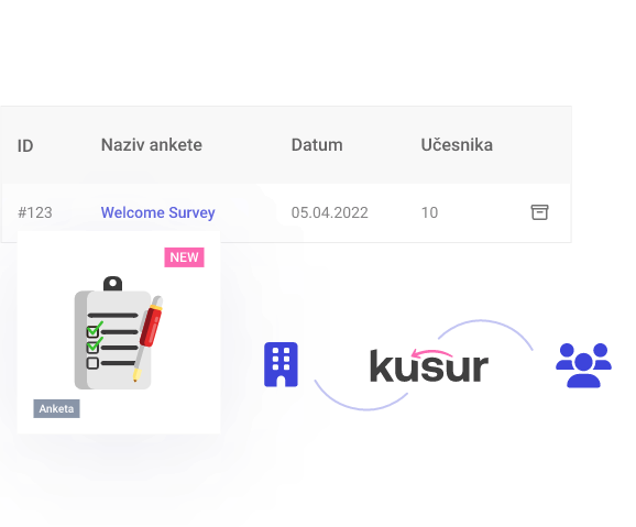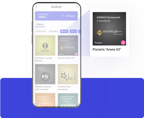 Povezivanje na Vaš objekat ili zamjena kupona za ponudu kreira digitalnu poveznicu između objekta i korisnika aplikacije, što omogućava da svojim kupcima šaljete upitnike i notifikacije direktno na njihove mobilne uređaje putem Kusur aplikacije.